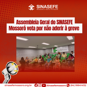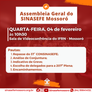 📍Na quarta-feira, 04, a partir das 10h30, esperamos nossos sindicalizados e sindicalizadas para participar da Assembleia Geral Presencial realizada na Sala de Videoconferência do IFRN - Campus Mossoró.