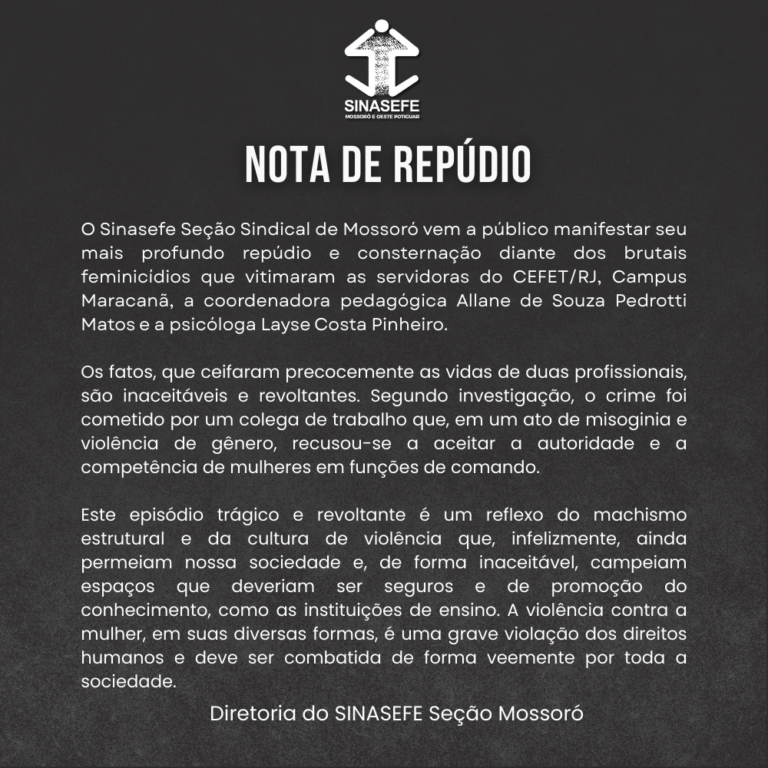Nota de repúdio O Sinasefe Seção Sindical de Mossoró vem a público manifestar seu mais profundo repúdio e consternação diante dos brutais feminicídios que vitimaram